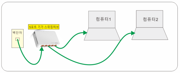 위 그림과 같이 현재 벽단자와 컴퓨터가 연결되어있는 랜케이블을 스위칭허브에 연결하시고