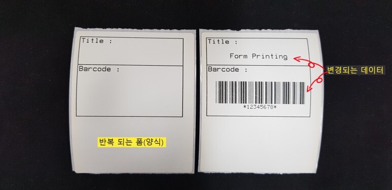 위 사진에서 보는 것 같이 라벨 인쇄시 항상 인쇄되는 표 또는 문구 로고등이 있는 폼(양식)이 있고 폼 안에 변경되는 데이터를 인쇄해야 하는 경우 계속 반복하여 인쇄하는 폼(양식)을 프린터에 저장해 두고 프로그램에서는 변경되는 데이터만 보내주고 폼은 호출하여 인쇄하는 방법이 있습니다.