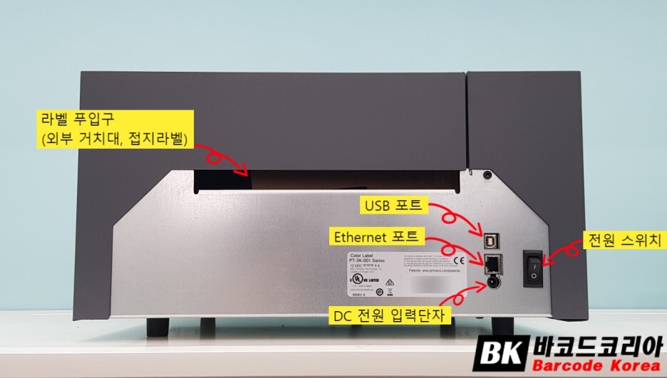 컬러 라벨프린터 LX3000 뒷면에는 외부 거치대, 또는 접지라벨 투입을 위한 라벨 투입구와 전원단자, 전원스위치, USB 포트, Ethernet 포트가 있습니다.