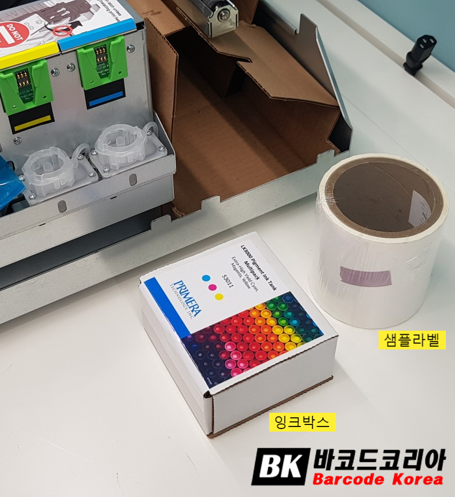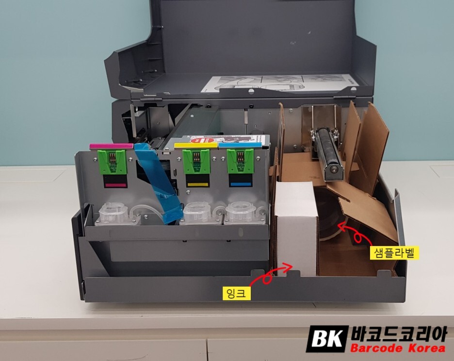컬러 라벨프린터 LX3000 덮개를 열면 내부에 잉크 들어 있는 박스와 샘플라벨이 있습니다.