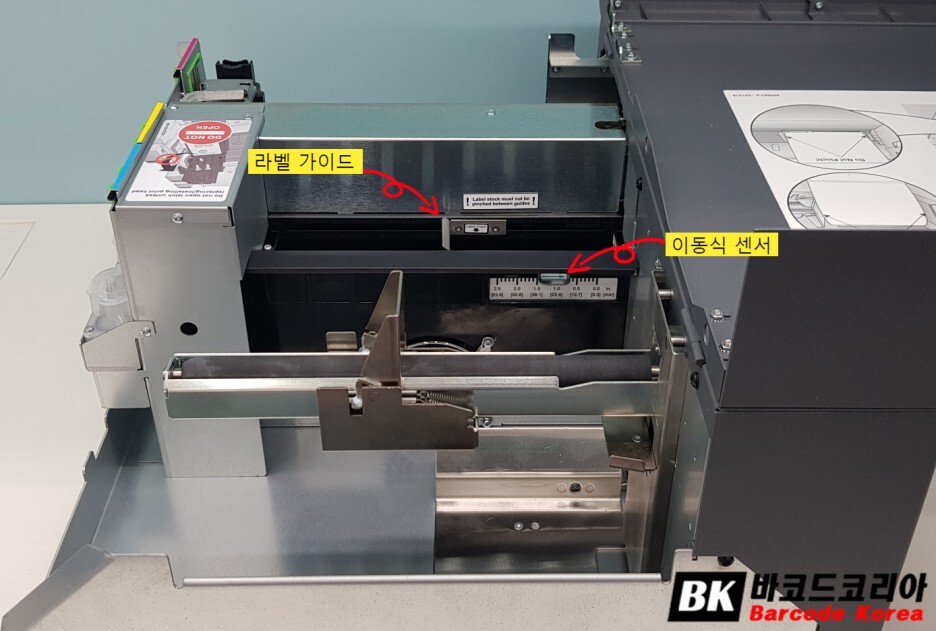 라벨 투입 부분에는 이동식 센서와, 라벨 가이드가 있습니다.