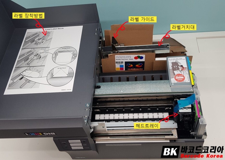 컬러라벨프린터 LX3000 내부에는 헤드 트레이, 라벨거치대, 라벨가이드가 보이고 커버 안쪽에는 라벨 장착하는 방법이 부착되어 있습니다.