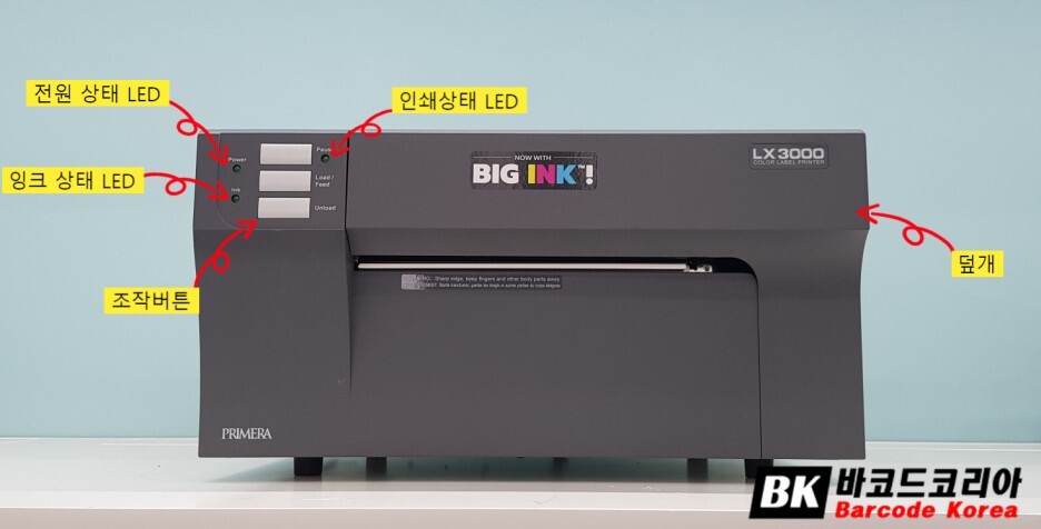 컬러 라벨프린터 LX3000 정면에는 덮개, 조작버튼, 전원, 잉크, 인쇄 상태를 표시해 주는 LED 가 있습니다.