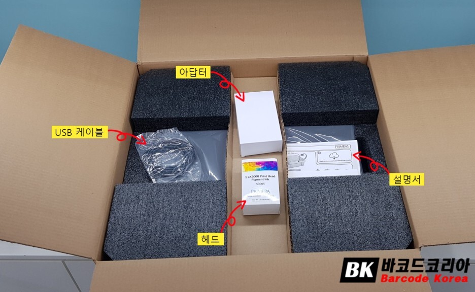 컬러 라벨프린터 LX3000 박스를 열면 가운데 아답터 박스와 잉크헤드 박스, USB 케이블, 설명서가 보입니다.