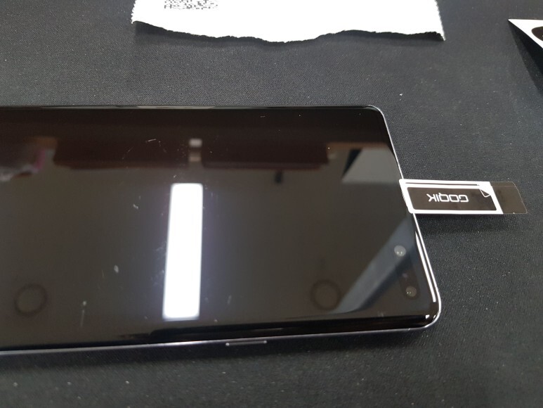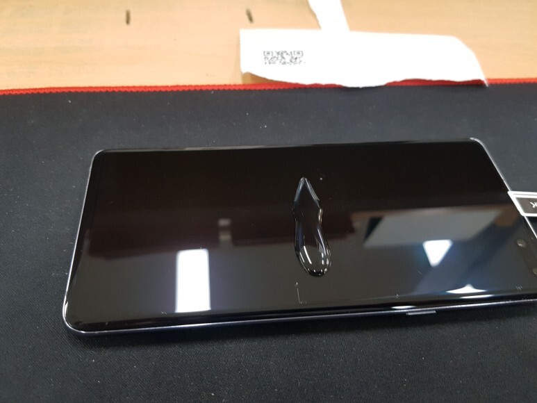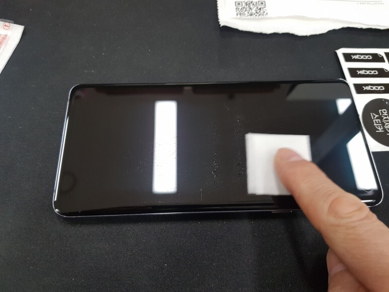비닐 제거 후 용액 위로 강화유리를 살포시 얹고 용액이 전체적으로 퍼지도록 해야 하는데 여기서 시간이 조금 걸렸습니다. 오래 기다려도 끝까지 퍼지지 않아 살살 두드려 주었습니다.