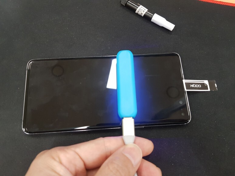 용액이 퍼지지 않은 끝부분, 모서리 부분에 용액을 한두방울 떨어뜨려 스며들게 하여 강화유리 전체면에 UV 용액이 다 퍼지도록 했습니다.