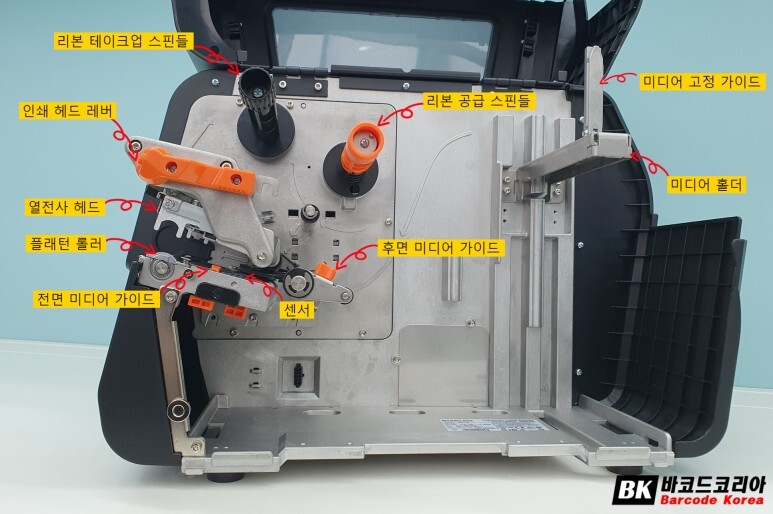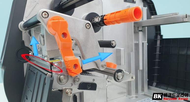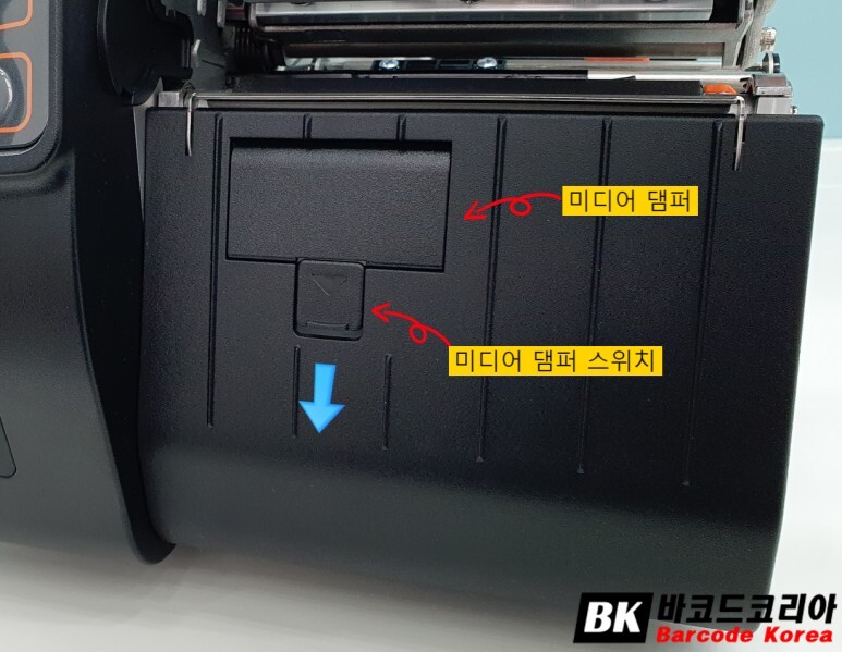 미디어 댐퍼는 라벨 인쇄시 리본 가이드에 라벨이 붙거나 라벨 끝단이 접혀서 출력될 때 올려사용하면 개선됩니다.
