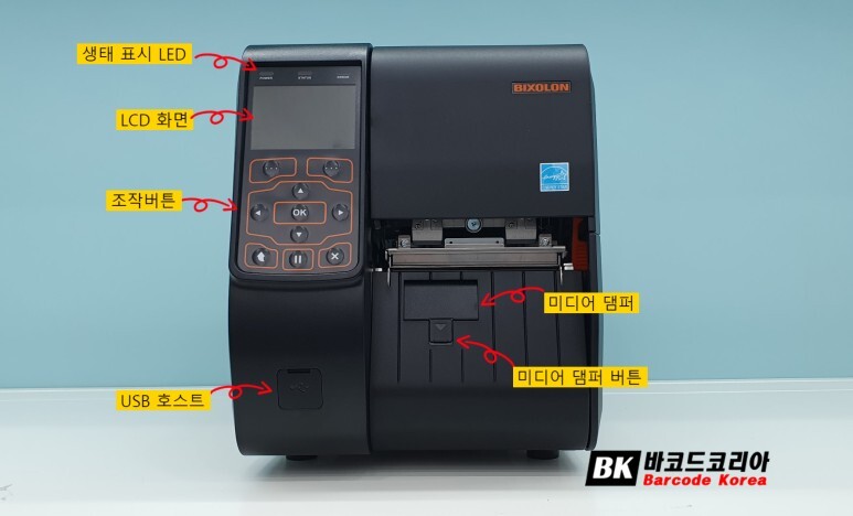 정면에는 상태표시LED, LCD 화면, 조작버튼, USB호스트, 미디어 댐퍼, 미디어 댐퍼 버튼이 있습니다.