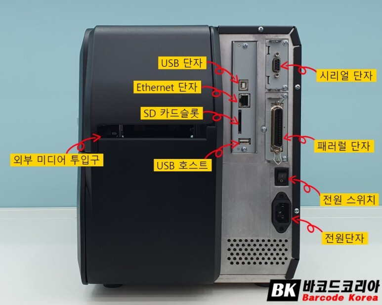 제품 뒷면에는 외부 미디어 투입구, USB, Ethernet, 시리얼, 패러럴 단자와, SD 카드슬롯, USB 호스트, 전원스위치, 전원 단자가 있습니다.