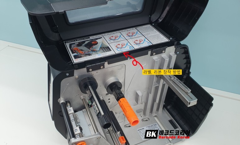 커버 안쪽에는 라벨, 리본 장착 방법이 부착되어 있습니다.