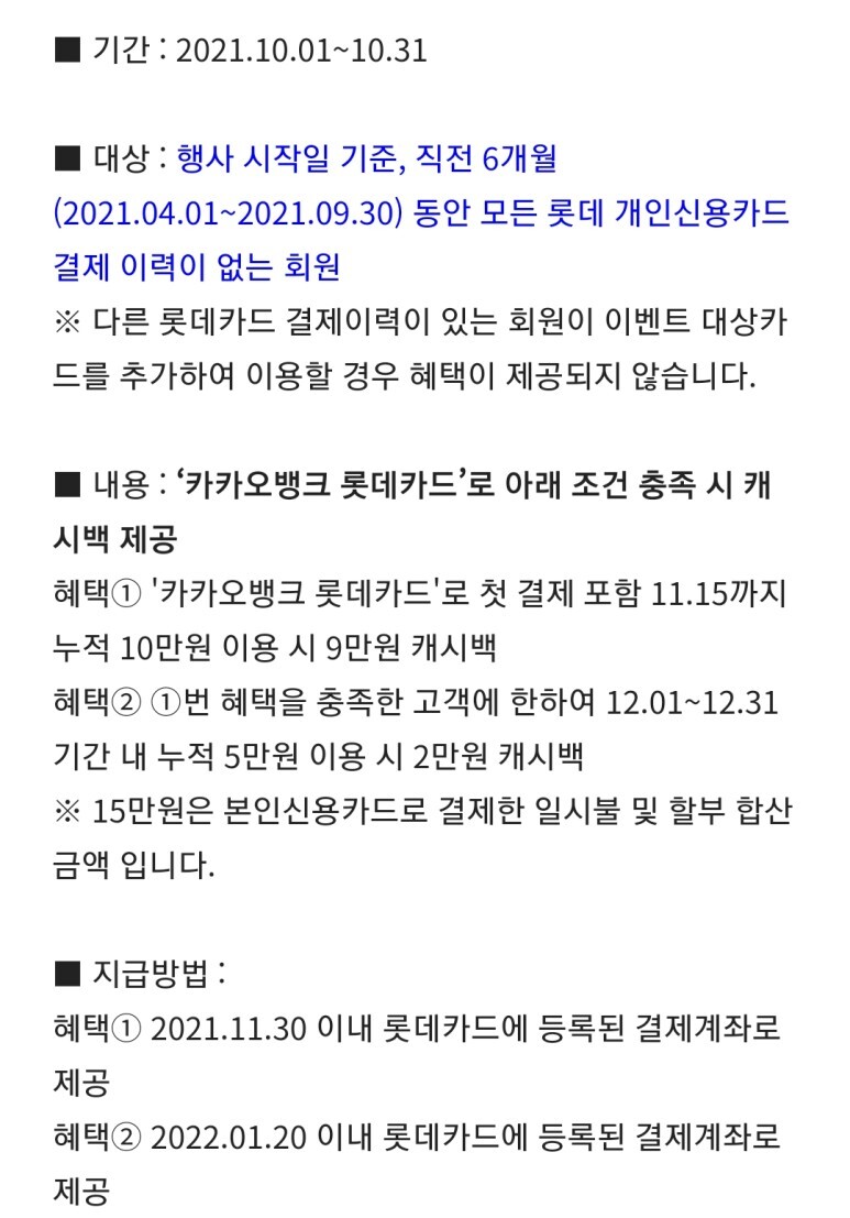 11월 15일 까지 누적 10만원을 사용하면 9만원 캐시백 받을 수 있고, 9만원 받은 분들에 한해 12월 31일 까지 누적 5만원을 사용하면 2만원을 캐시백 해줍니다.