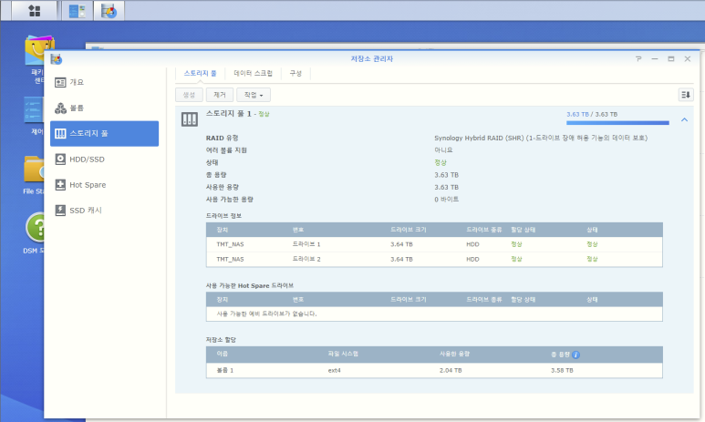 NAS 전원을 켜고 접속하여 DS713+ 저장소 관리자 -> 작업 탭에 있는 수리 메뉴를 클릭하여 RAID 구성을 복구 합니다. 2T 정도 데이터를 미러링 해야되서 시간이 많이 소요 되었습니다.