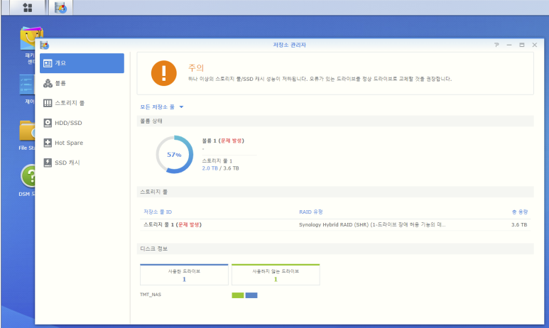 2개의 하드디스크를 RAID 로 구성하여 사용하고 있는데 저장소 관리자를 확인해 보니 한개의 디스크에서 문제가 발생하여 오류 발생한 하드디스크를 교체하라고 안내 하고 있습니다.
