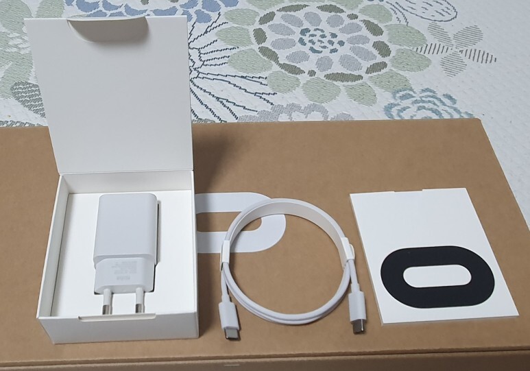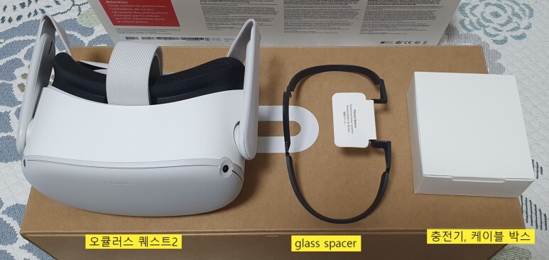 오큘러스 퀘스트2 본체, 안경 착용자를 위한 스페이서, 충전기, 케이블 박스입니다.