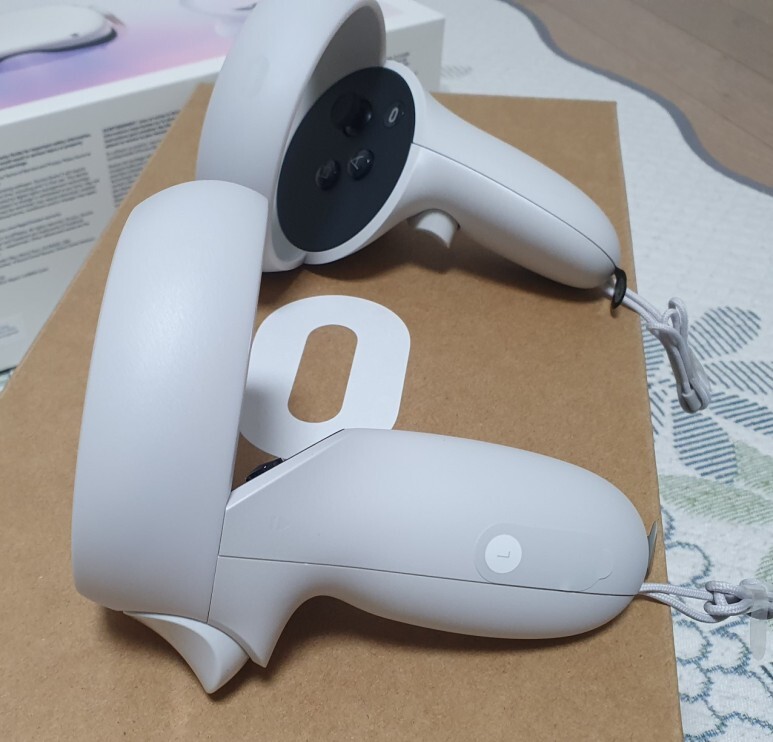 박스 안에는 컨트롤러 왼쪽, 오른쪽 2개와 오큘러스 퀘스트2 본체, 아답터, 충전케이블이 들어 있는 박스가 들어 있습니다.