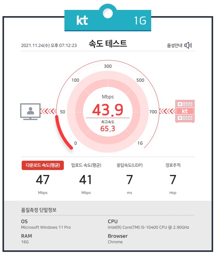 다운로드 47Mbps, 업로드 41Mbps 의 인터넷 속도를 보여줍니다.