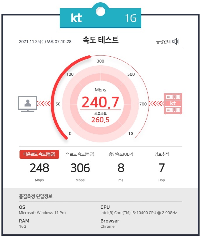다운로드 248Mbps, 업로드 306Mbps 의 인터넷 속도를 보여줍니다.