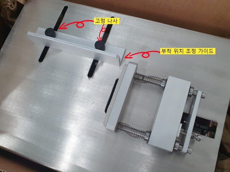 제품 상판에는 라벨 부착위치를 조정할 수 있는 가이드와 가이드를 고정해 주는 나사가 있습니다.