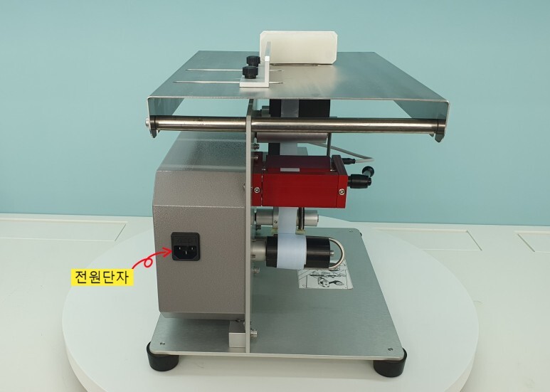 제품을 정면에서 보면 오른쪽 부분은 라벨을 걸어 공급하고 중앙은 라벨 부착, 왼쪽은 리와인더에서 후지를 당기며 회수하는 구조입니다.