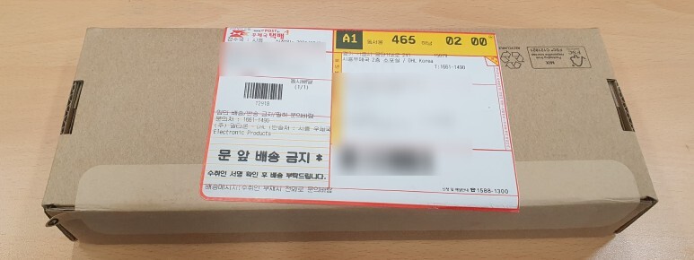 박스에 송장라벨이 앞, 뒤로 2장 붙어 있습니다. 하나는 DHL, 하나는 우체국택배 입니다.
