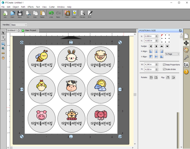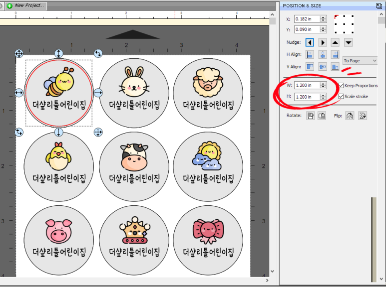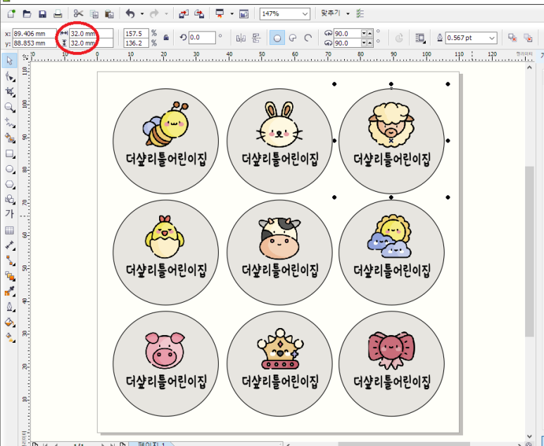 칼 작업용 원형 도형을 모든 라벨에 복사하여 적용했습니다.