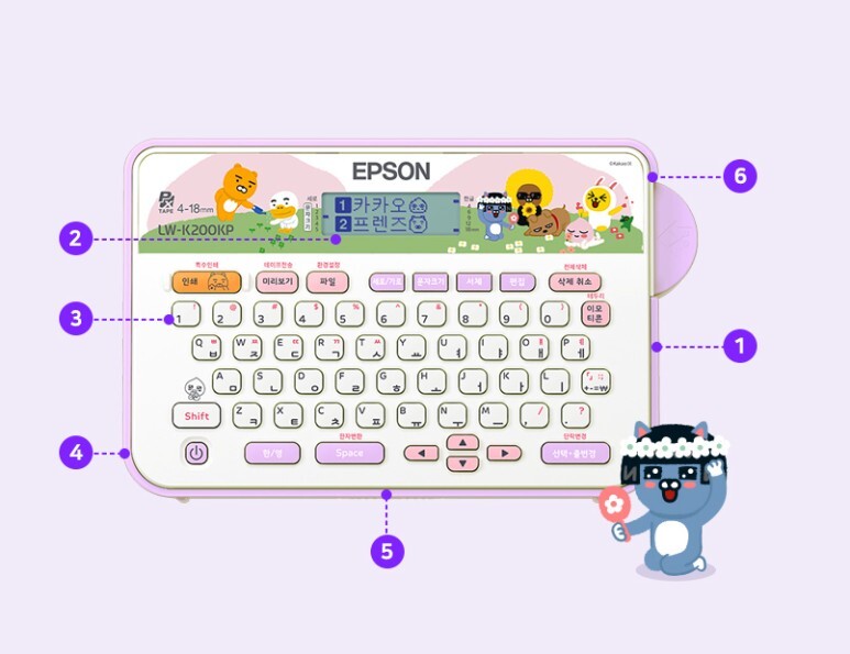 엡손 카카오프렌즈 라벨프린터는 카카오프렌즈 캐릭터 그림 문자가 들어있어 귀여운 카카오프렌즈 캐릭터로 개성 있는 라벨을 출력할 수 있습니다.