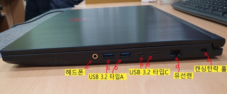 오른쪽 측면에는 헤드폰단자, USB 3.2 A타입 2개, USB 3.2 C타입 2개, 유선랜(기가비트), 캔싱턴락 홀이 있습니다. 무선네트워크장치는 802.11 ac Wi-Fi + 블루투스 v5.0 입니다.