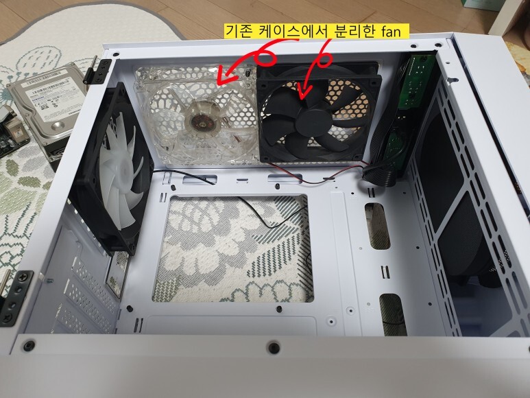 기존 사용하던 케이스에서 분리한 fan 두개를 추가로 상단 부분에 달았습니다.