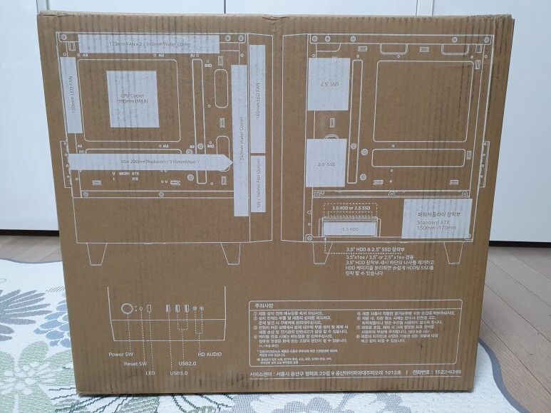 박스 뒷면에는 장착 가능한 쿨러규격, SSD, HDD 장착위치 등이 설명 되어 있습니다.