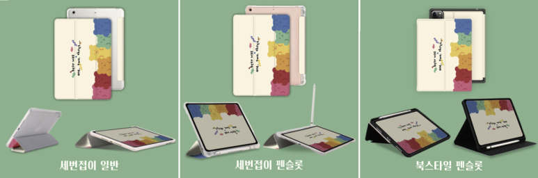 아이패드 9세대를 구입하고 케이스를 어떤 제품으로 구입할까 고민하다 알게된 포이베 아이패드 9세대 케이스 입니다. 개성있는 31가지의 디자인이 준비되어 있고 애플펜슬 사용여부와 케이스 접는 방식에 따라 세번접이 일반, 세번접이 펜슬롯, 북스타일 펜슬롯 3가지 타입을 선택할 수 있습니다.