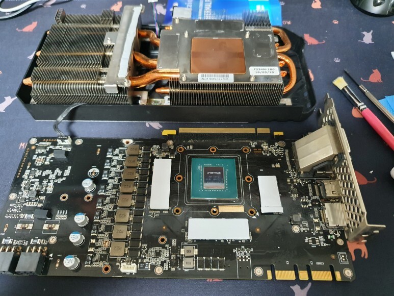 GPU 주변 소자들에 묻어 있는 서멀그리스는 붓으로 살살 제거해 줬습니다. 세게 작업하면 소자가 떨어져 나갈수 있어 적은 힘으로 여려번 제거 했습니다.