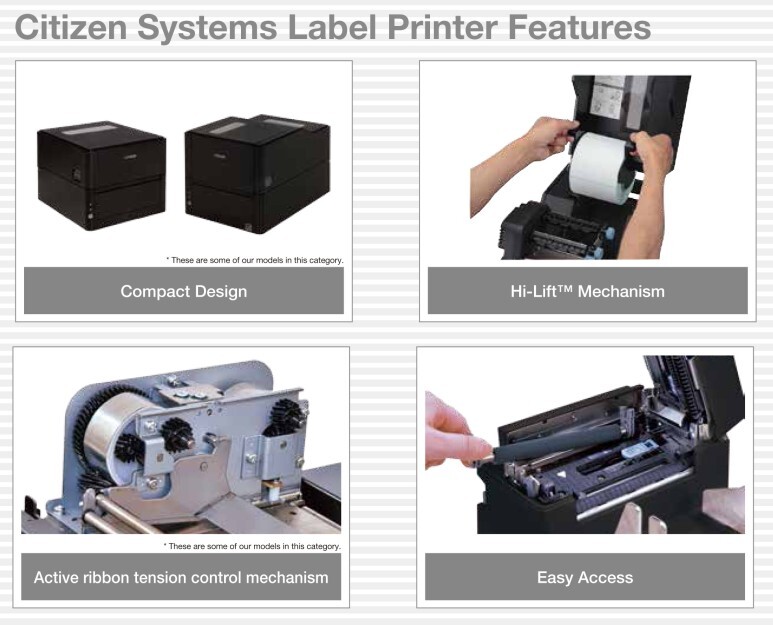CITIZEN 라벨프린터는 컴팩트한 디자인(일부 해당 카테고리 제품), 제품 덮개가 수직 방향으로 열리는 방식, 리본 꼬임 방지기술(일부 해당 카테고리 제품)이 적용되어 리본 꼬임문제를 최소화 했으며 유지보수 관리를 쉽게 하도록 설계 되었습니다.