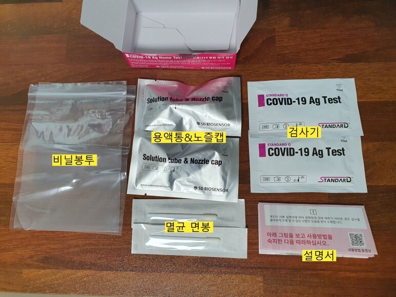 박스 안에는 비닐봉투 2개, 용액통&노즐캡 2개, 멸균면봉 2개, 검사기 2개, 설명서가 들어 있습니다.
