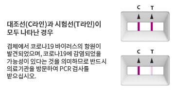 "STANDARD Q COVID-19 Ag Home Test는 SARS-Cpv-2 바이러스 항원에 대한 선별검사로써, 대조선과 시험선이 모두 나타난 경우 의료기관을 방문하여 확진검사를 받으시기 바랍니다."