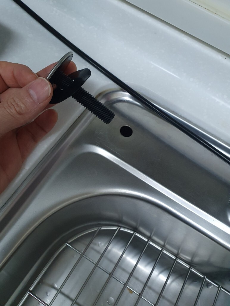 싱크대 안쪽에서 플라스틱으로된 손잡이달린 너트로 마개가 잘 밀착 되도록 꽉 조였습니다.