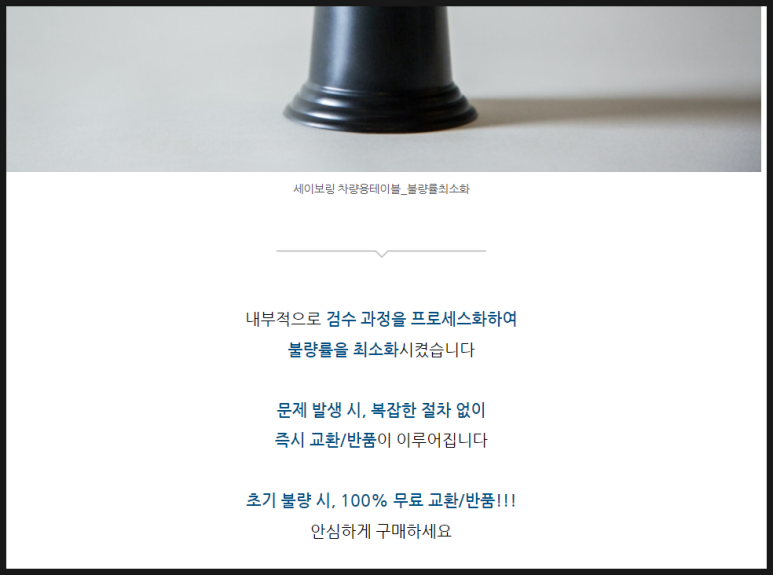 상품 소개란에 불량률을 줄이기 위해 검수를 프로세스화 하여 불량품이 출고되지 않는다는 내용과 문제 있을 시, 100% 무료 교환/반품 해준다고 하니 믿음이 갑니다.