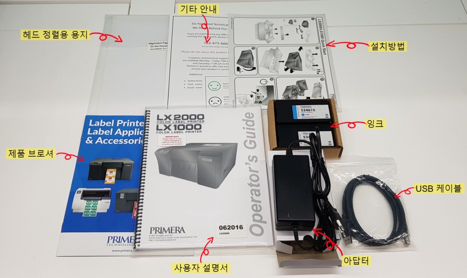 헤드 정렬용 용지, 제품 브로셔, 사용자 설명서, 아답터, USB케이블, 잉크, 설치방법, 기타 안내지가 들어 있습니다.