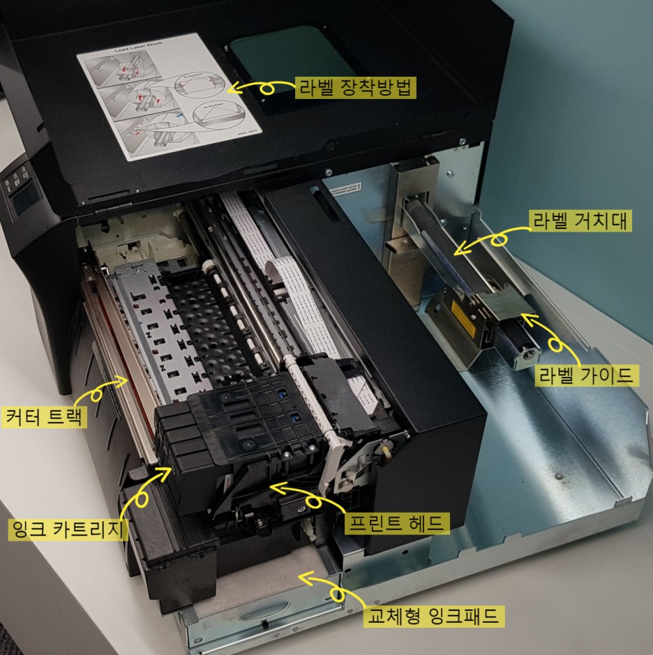 제품 안쪽에는 커터 트랙, 잉크 카드리지, 프린트 헤드, 교체형 잉크패드, 라벨거치대, 라벨 가이드가 보이고 커버 안쪽에는 라벨 장착하는 방법이 부착되어 있습니다.