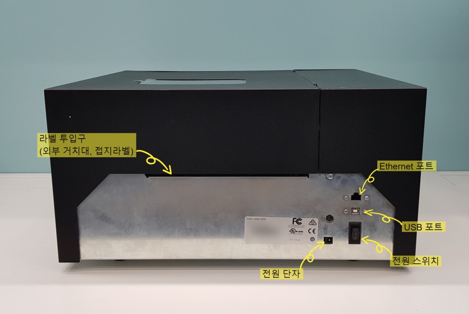 뒷면에는 라벨투입구, 전원단자. 전원 스위치, USB, Ethernet 포트가 있습니다.