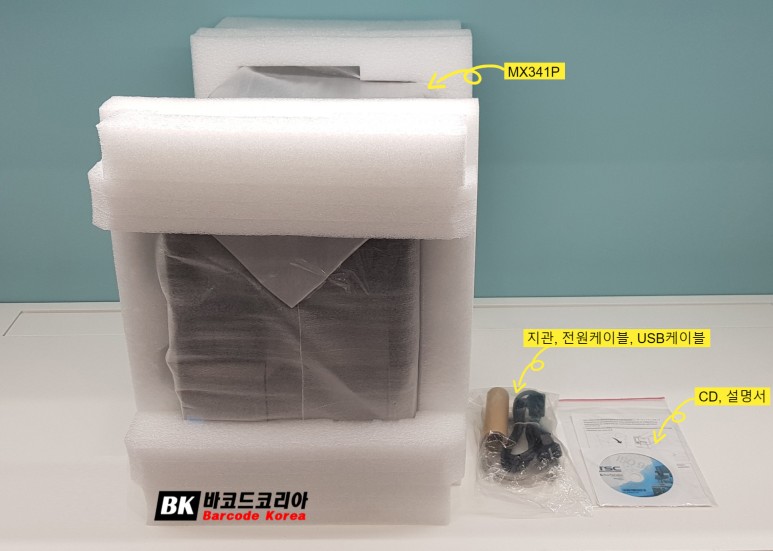박스안에는 깁스 한것 처럼 포장되어 있는 MX341P, 지관,전원케이블,USB케이블,CD, 설명서가 들어 있습니다.
