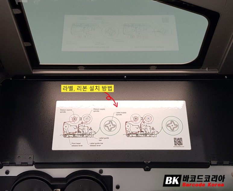 덮개 안쪽에는 라벨, 리본 설치 방법이 설명되어 있습니다.