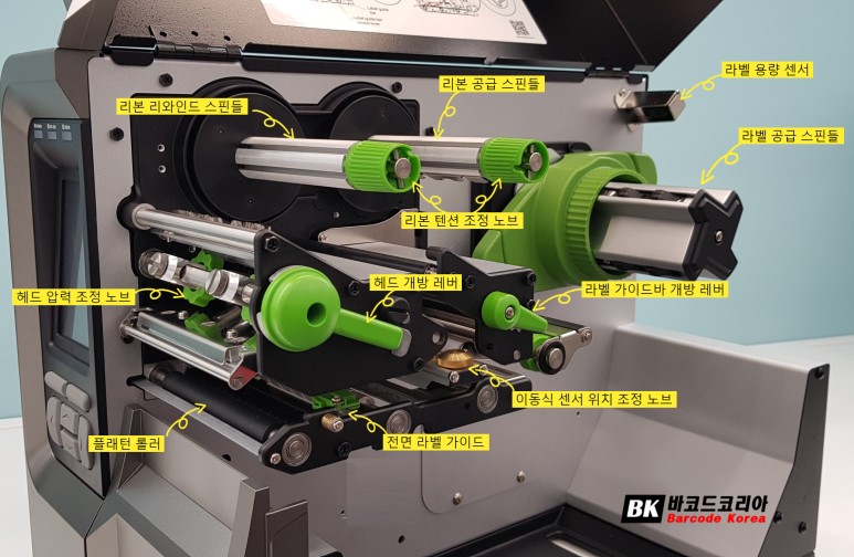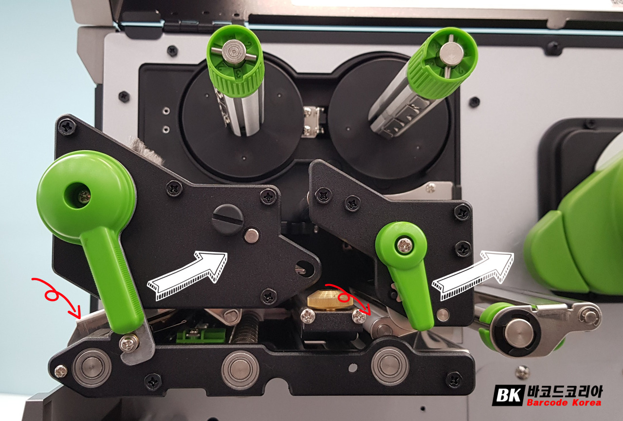헤드 개방 레버와 라벨 가이드바 개방레버를 뒤로 밀면 헤드어셈블리, 라벨 가이드바가 위로 올라갑니다.
