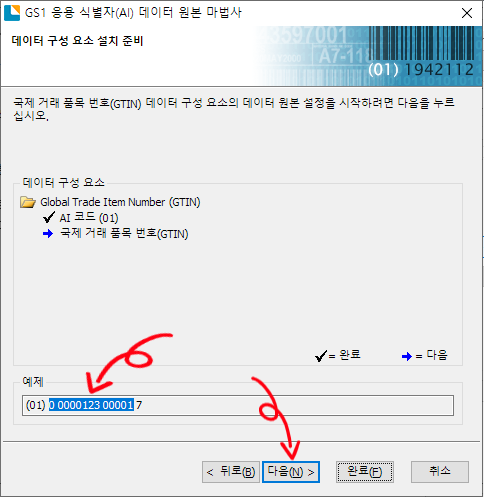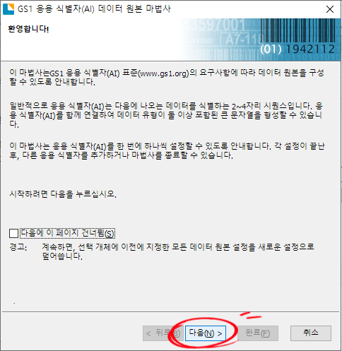 GS1 응용 식별자(AI) 데이터 원본 마법사를 클릭하면 마법사 시작 화면이 나옵니다. 다음을 클릭합니다.