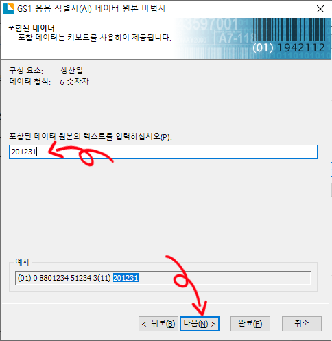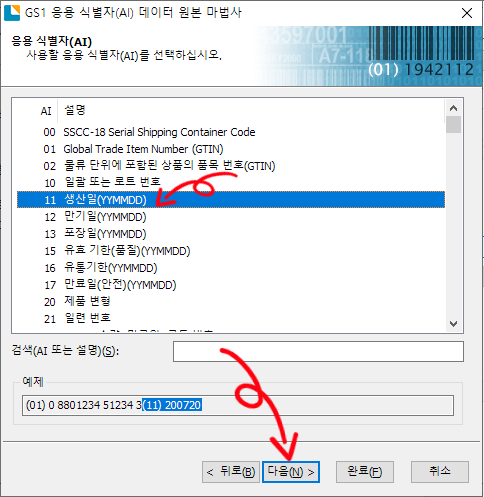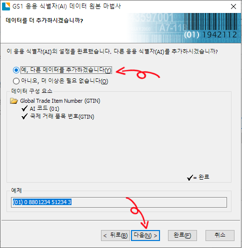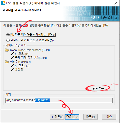 GITN 입력이 완료되었다는 화면이 나옵니다. 이 화면에서 생산일을 추가하기 위해 다른 데이터 추가를 선택하고 다음을 클릭하면 응용 식별자 선택 화면이 다시 나옵니다. 여기서 생산일 식별자번호인 11 을 선택하면 아래쪽에 예제 데이터를 보여줍니다. 다음을 클릭합니다.