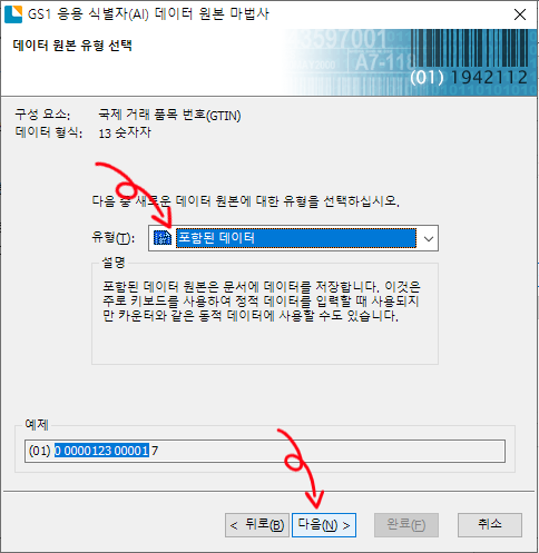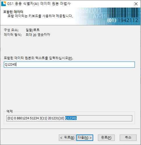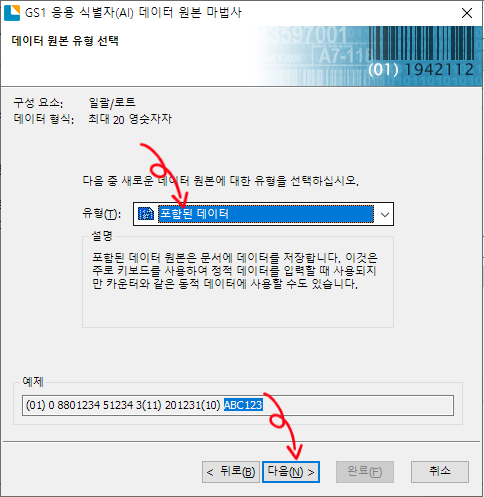 데이터 원본 유형 선택 화면에서 포함된 데이터를 선택하고 다음을 클릭하여 회사에서 사용하고 있는 규격의 로트번호를 입력하면 됩니다. 최대 20자리이며 영문숫자 입력 가능합니다.