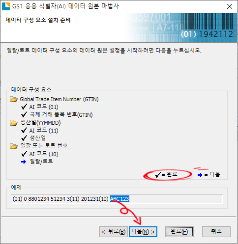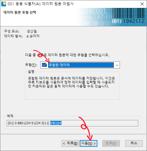 생산일 식별자 설정이 완료되었다는 화면이 나오면 다음을 클릭하여 포함된 데이터를 선택후 다음을 클릭합니다.