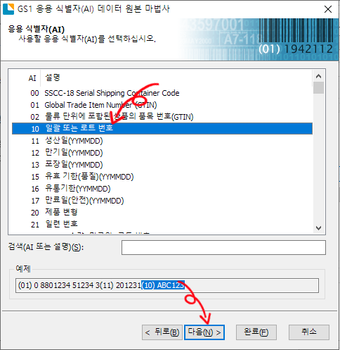 응용 식별자 선택 화면이 나오면 로트번호 식별자번호인 10 을 선택하고 다음을 클릭합니다. 그러면 로트번호 식별자 설정이 완료되었다는 화면이 나옵니다.