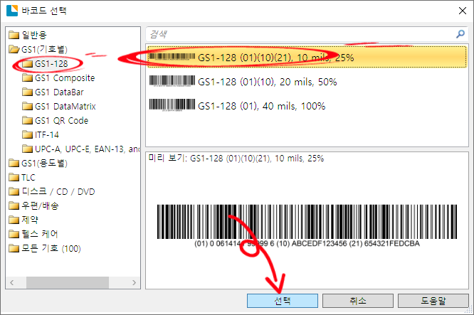 바코드 선택 창에서 GS1-128 클릭하여 선택합니다.