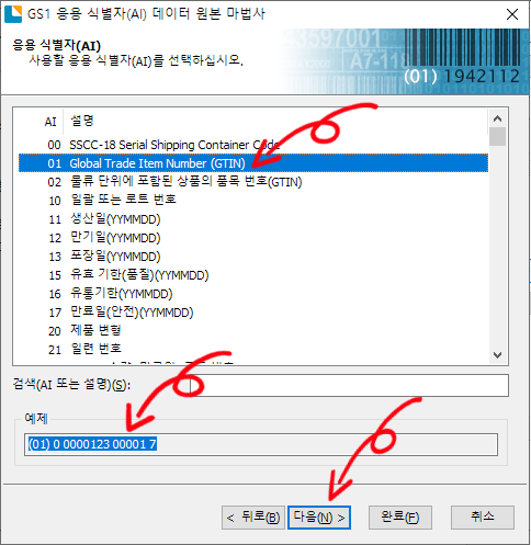 응용 식별자(AI) 선택 화면에서 01 GTIN 을 선택하면 아래에 예제 데이터 값을 보여 줍니다.