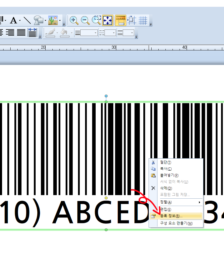 화면에 바코드가 표시되면 마우스 오른쪽 버튼을 클릭하여 등록정보를 클릭합니다.